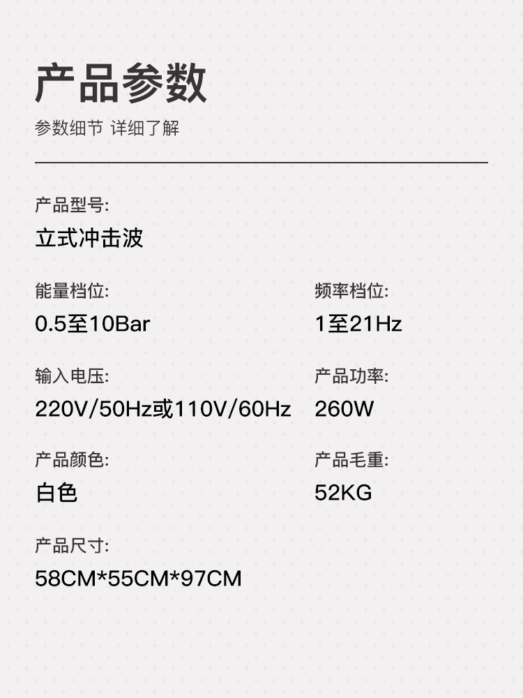 立式气动冲击波理疗仪 · 产品型号:SW25 · 产品类型:冲击波系列产品主要功效: · 提供多种治疗方案 · 空化效益 打散粘连 · 促进软组织修复 · 刺激神经 缓解疼痛 · 减轻炎症水肿 加速康复