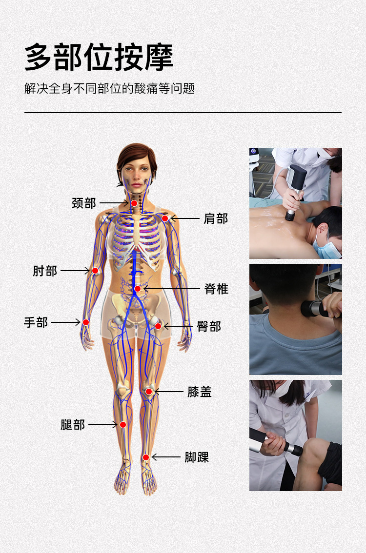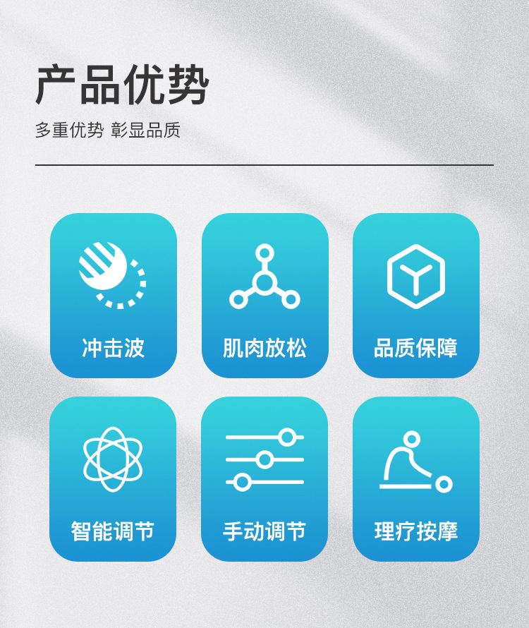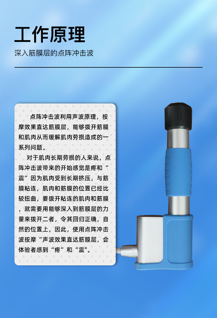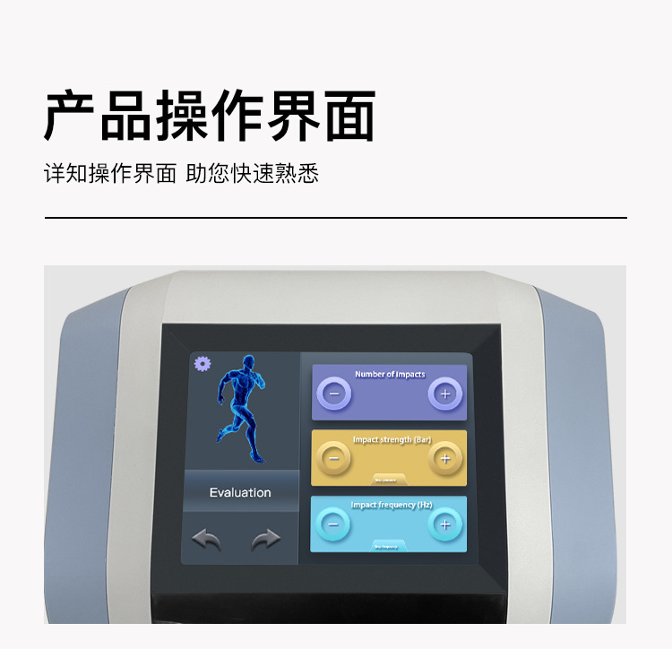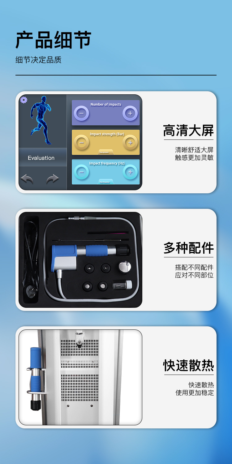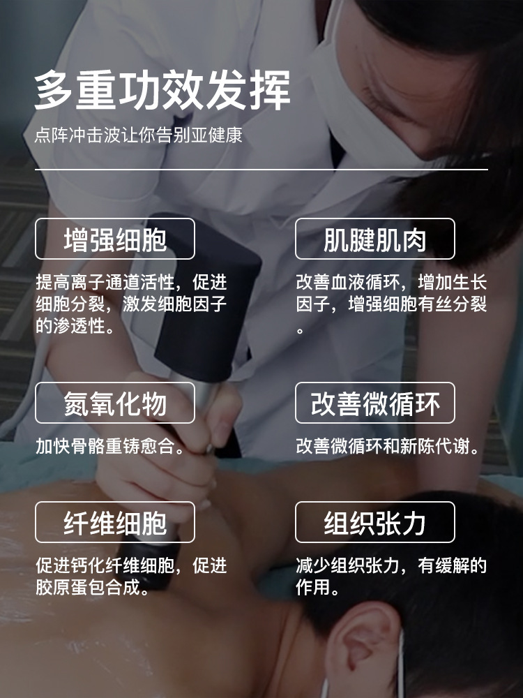 技术原理:气动弹道式冲击波:将气动产生的脉冲声波转换成冲击波,利用振子在空腔内高速运动产生振动,通过枪式探头耦合进入人体,冲击波治疗设备基于无聚焦的低能量径向波技术,该技术是一种在亚急性,亚慢性和慢性条件下将高能量输送到疼痛部位和纤维或肌骨骼组织的声波。这种能量促进肌睫和软组织的愈合,再生和修复过程。科学证明,未聚焦的低能量径向波对胶原蛋白结构和皮肤结缔组织有很大影响,可改善血液循环和脂肪细胞的代谢。机械按摩效果可减轻水肿并改善毒素的淋巴排泄。它刺激胶原蛋白的形成,而皮肤变得更有弹性,仅需几次治疗即可看到其紧致度。