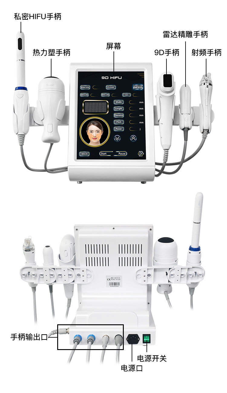 五合一9D+精雕+微针+LIPO+私密 · 产品型号:A0205-5C · 产品类型:超声系列产品主要功效: · 女性福音 私密功能 · 瘦身塑形 减小尺寸 · 祛除痘印痘痕 解决问题性皮肤 · 多排打点 抗衰去皱 · 刺激胶原蛋白增生 提高皮肤弹性